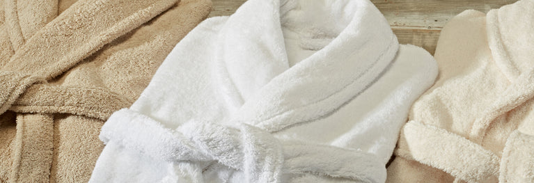 Explore nuestra colección de batas largas y suaves y albornoces de toalla de lujo, disponibles en una variedad de tamaños y colores, diseñados para realzar y complementar la decoración de su baño a la perfección.