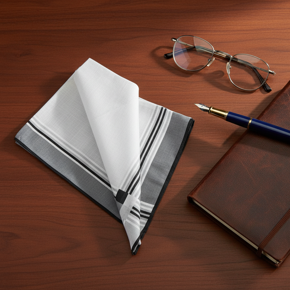 Choose between crisp white or soft light grey, each framed by a classic three-stripe border in black, white, and grey, lending a subtle contemporary twist to a traditional accessory. Durable, soft, and luxuriously smooth, it embodies understated sophistication for both everyday use and special occasions.