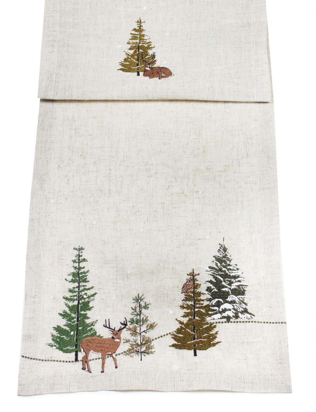 Bring a touch of enchanted woodland charm to your table with this beautifully embroidered Table Runner and matching Napkins. Crafted from a soft, natural-toned fabric, each piece captures a serene winter woodland scene — complete with graceful deer and snow-dusted trees — evoking a magical and festive atmosphere.